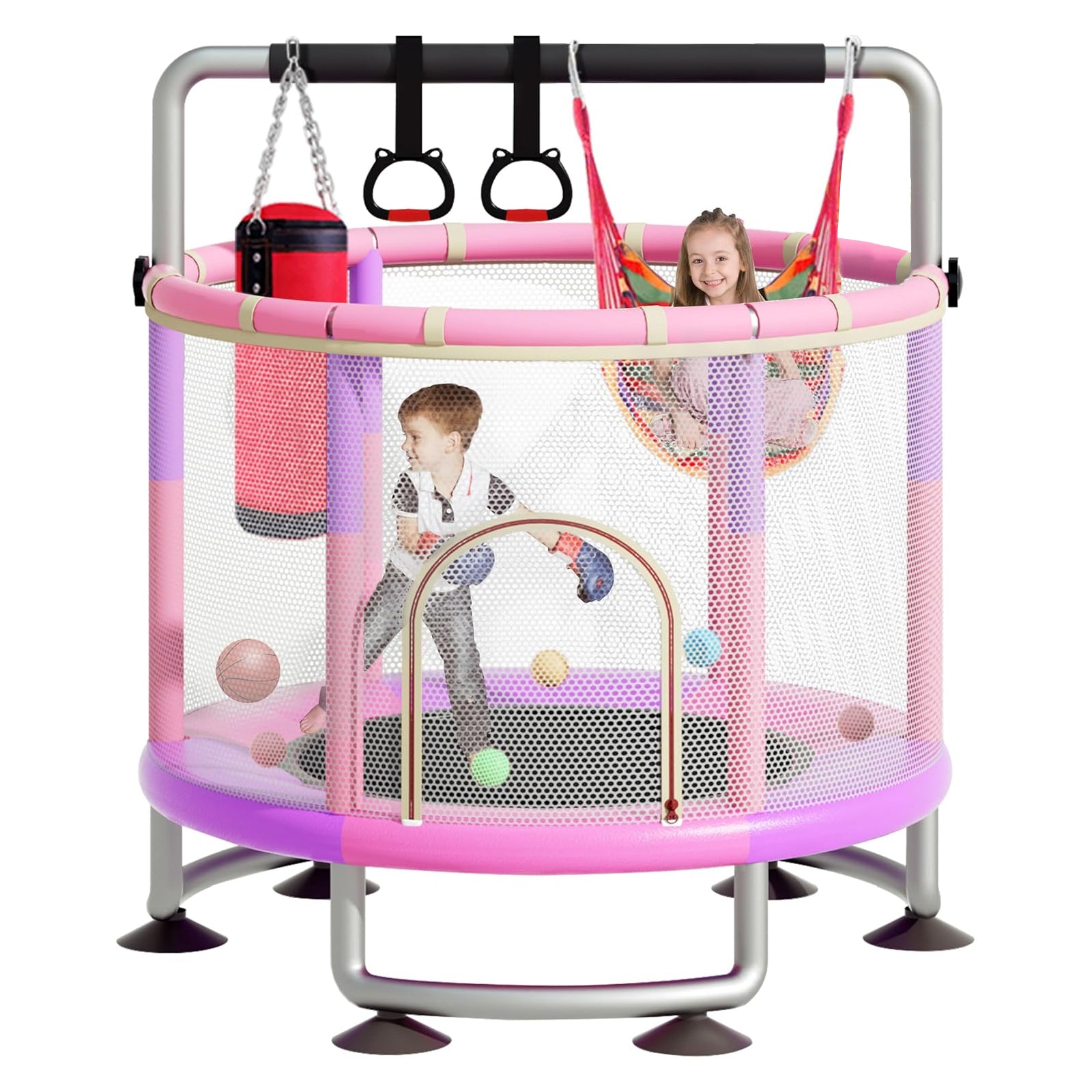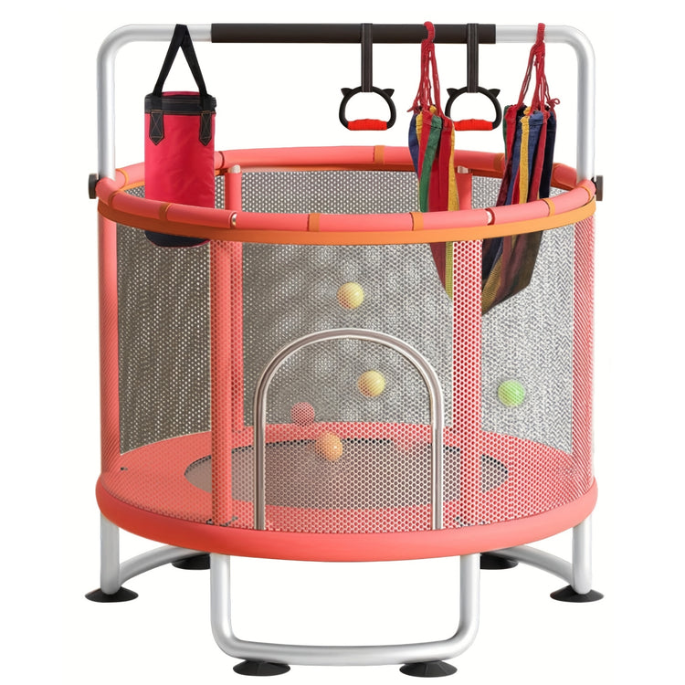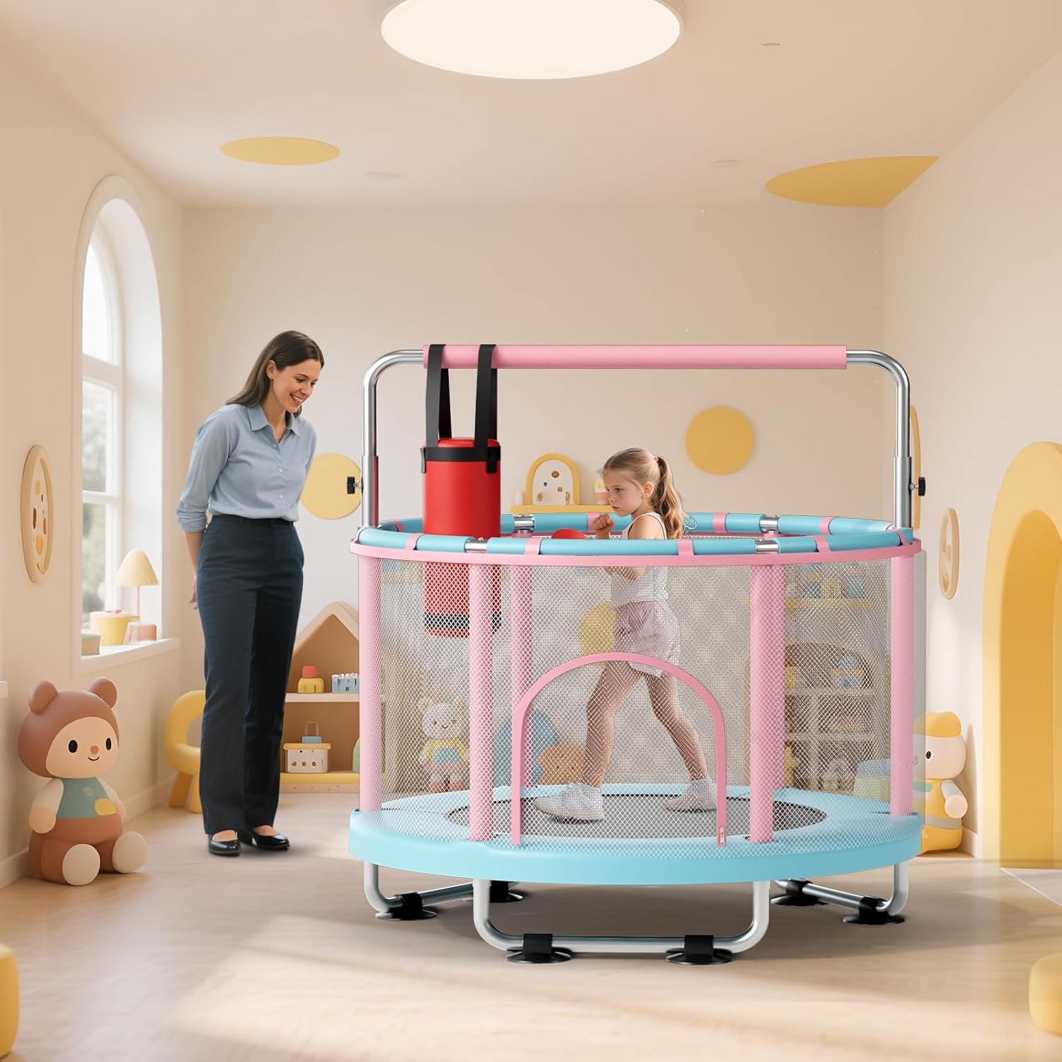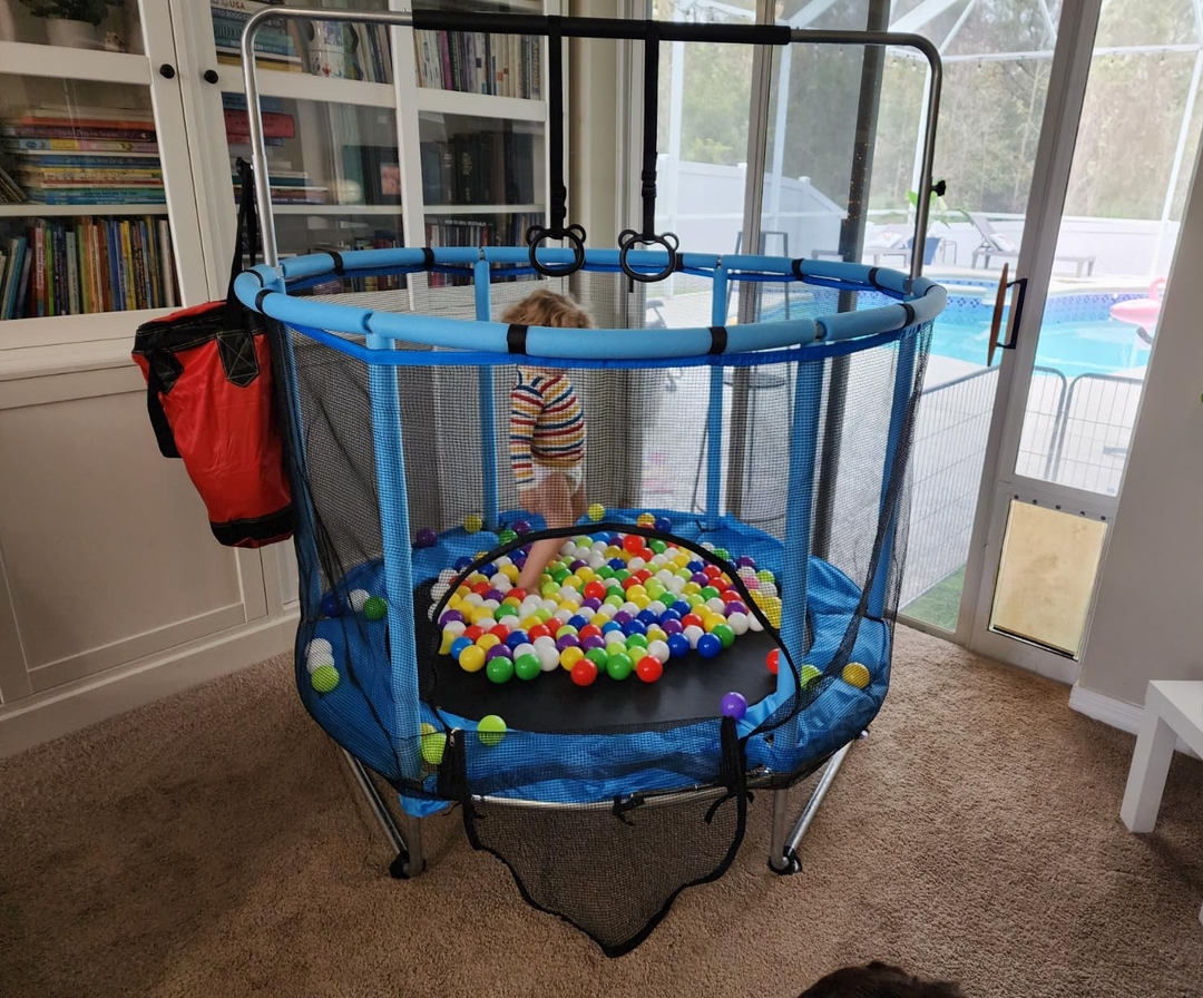 Available in 40"–60" diameters, it’s perfect for condos, tight living rooms, or playrooms. The sturdy netting fence surrounds the entire jumping surface so your little jumper can bounce, climb, and hang without a single trip to the ER.