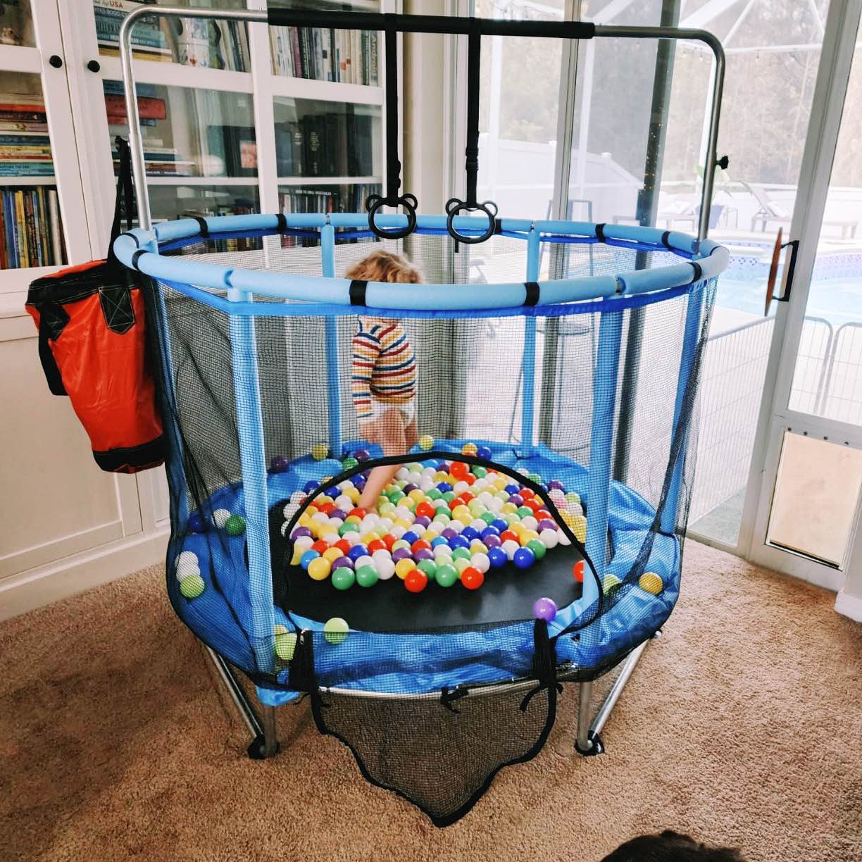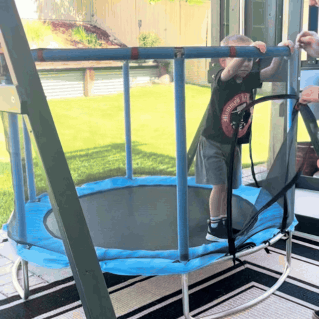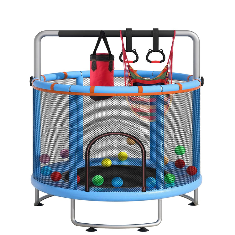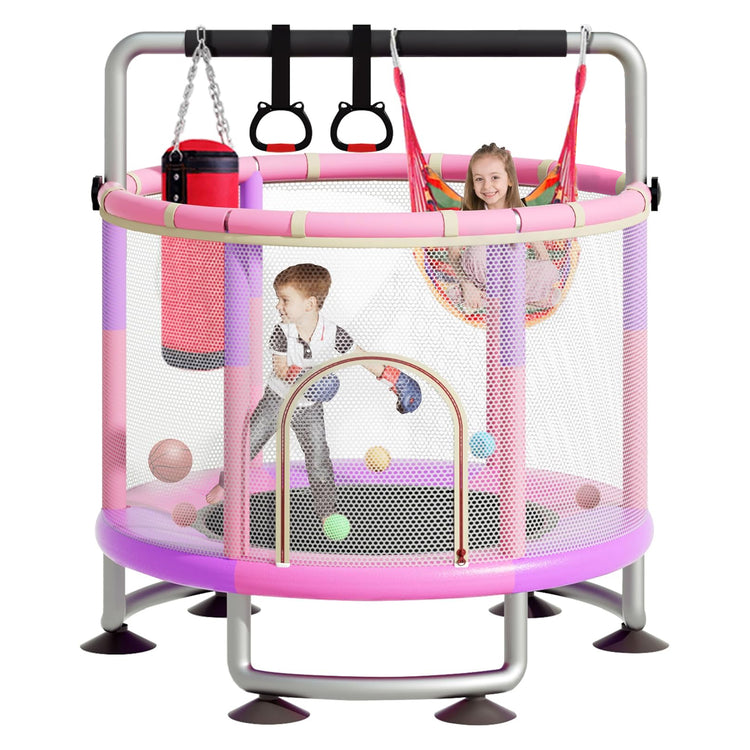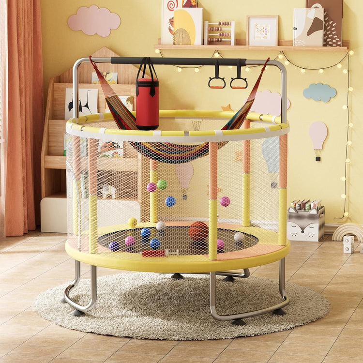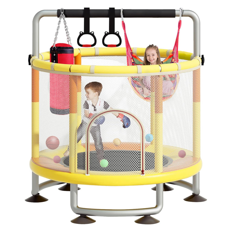 Available in 40"–60" diameters, it’s perfect for condos, tight living rooms, or playrooms. The sturdy netting fence surrounds the entire jumping surface so your little jumper can bounce, climb, and hang without a single trip to the ER.