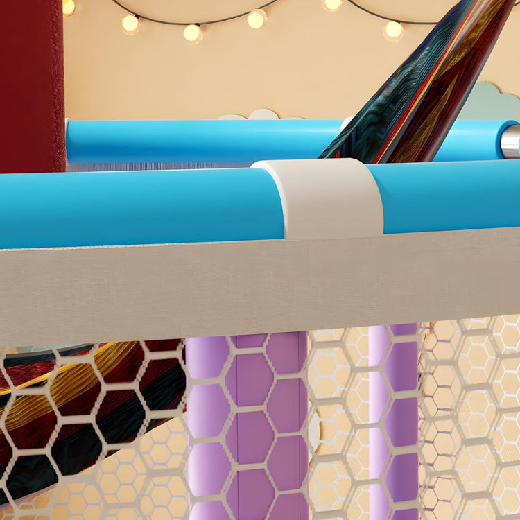 That single overhead bar does it all. Flip it into a hammock hook, turn it into a pull-up beam, or clip on a bag for boxing drills. Best part? The protective mesh fence sits right beneath—no falls, all thrills.