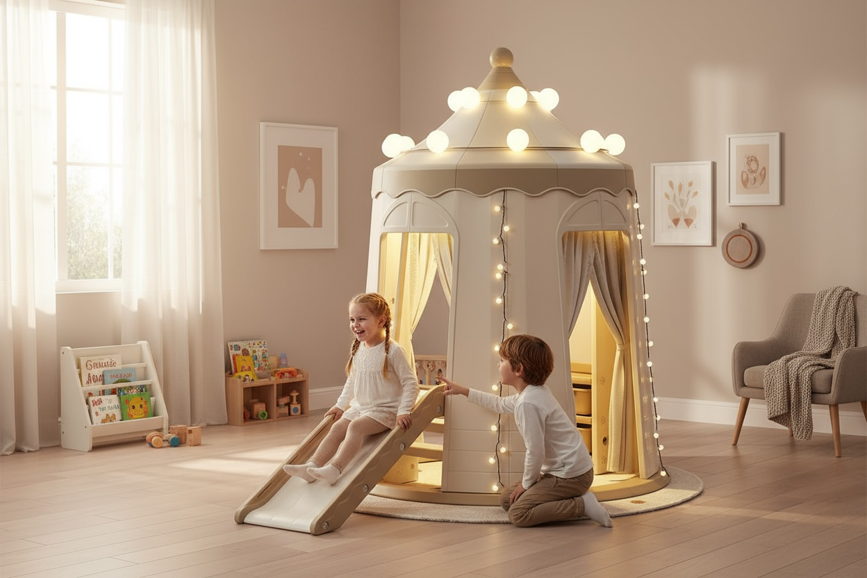 The integrated interior and exterior LEDs are thoughtfully designed to enhance every play scenario, whether your child is enjoying a quiet reading nook or transforming the space into a lively play palace. The exterior lighting sets the perfect ambiance for outdoor adventures, while the interior LEDs provide clear and gentle illumination for safe and comfortable play. The lighting's warm tones create a cozy atmosphere, fostering a sense of security and nurturing your child's imagination and spirit.