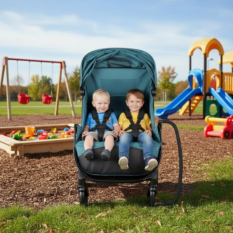 Say goodbye to cramped seats. Our smart, divider-free layout gives each child room to move, relax, and stretch—without shrinking the stroller’s usable width. Individual five-point harnesses keep them secure, and the removable bumper bar lets your little passengers hop on and off in sync. Short trips? You’ll instantly see why this design rules twin travel.