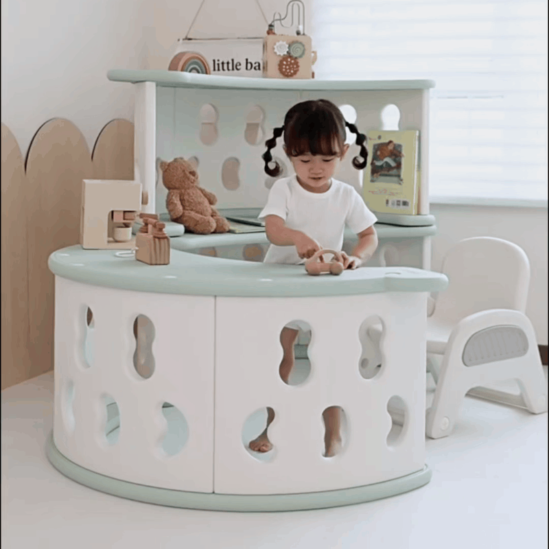 Need a table? Turn the banana curve into a stable desk surface. The semi-circular design seats children perfectly for drawing, puzzles, or snack time—then transform it right back for play.